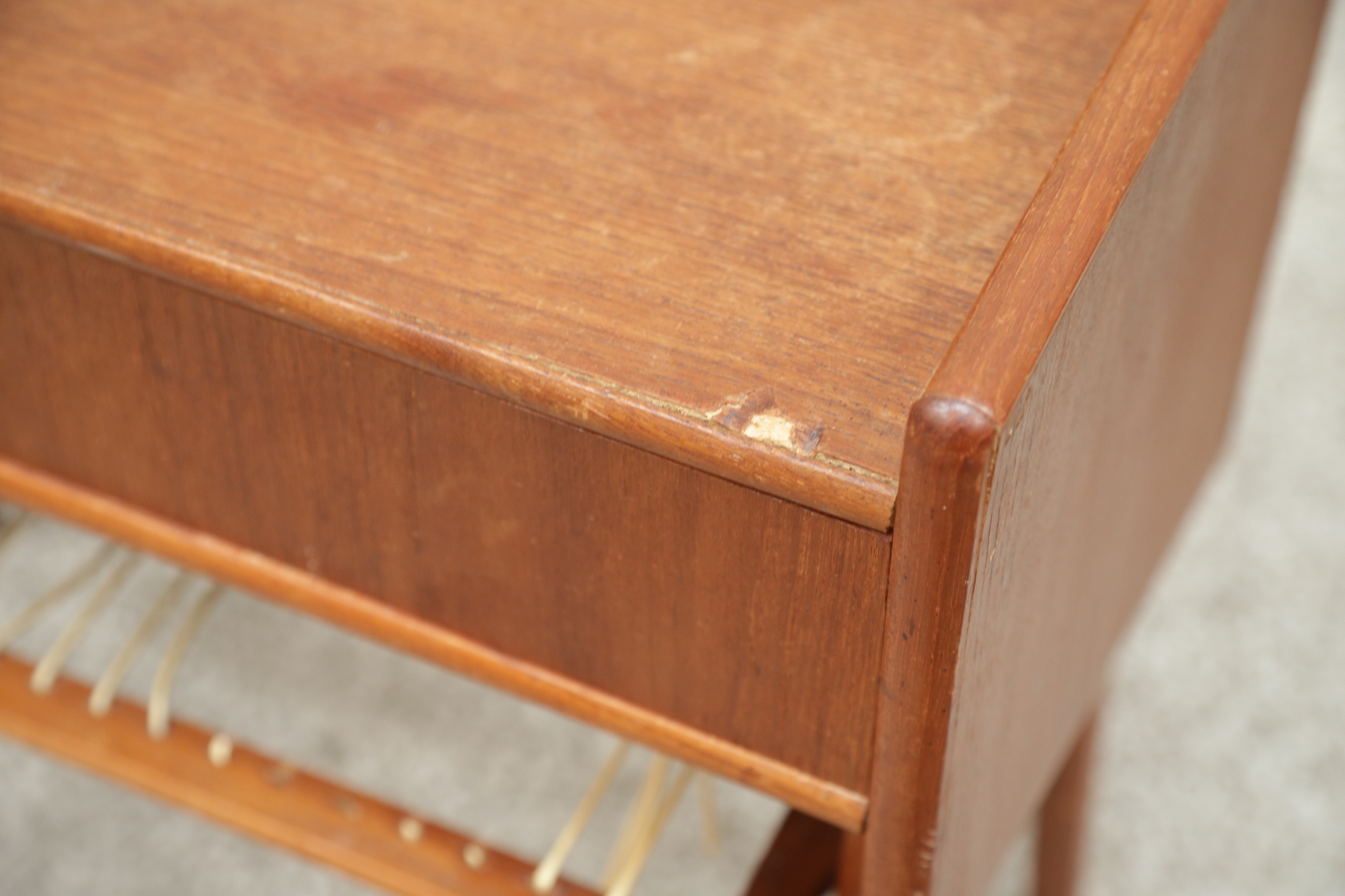 flettet skal skiftes og lille finérskade ved forreste kantliste