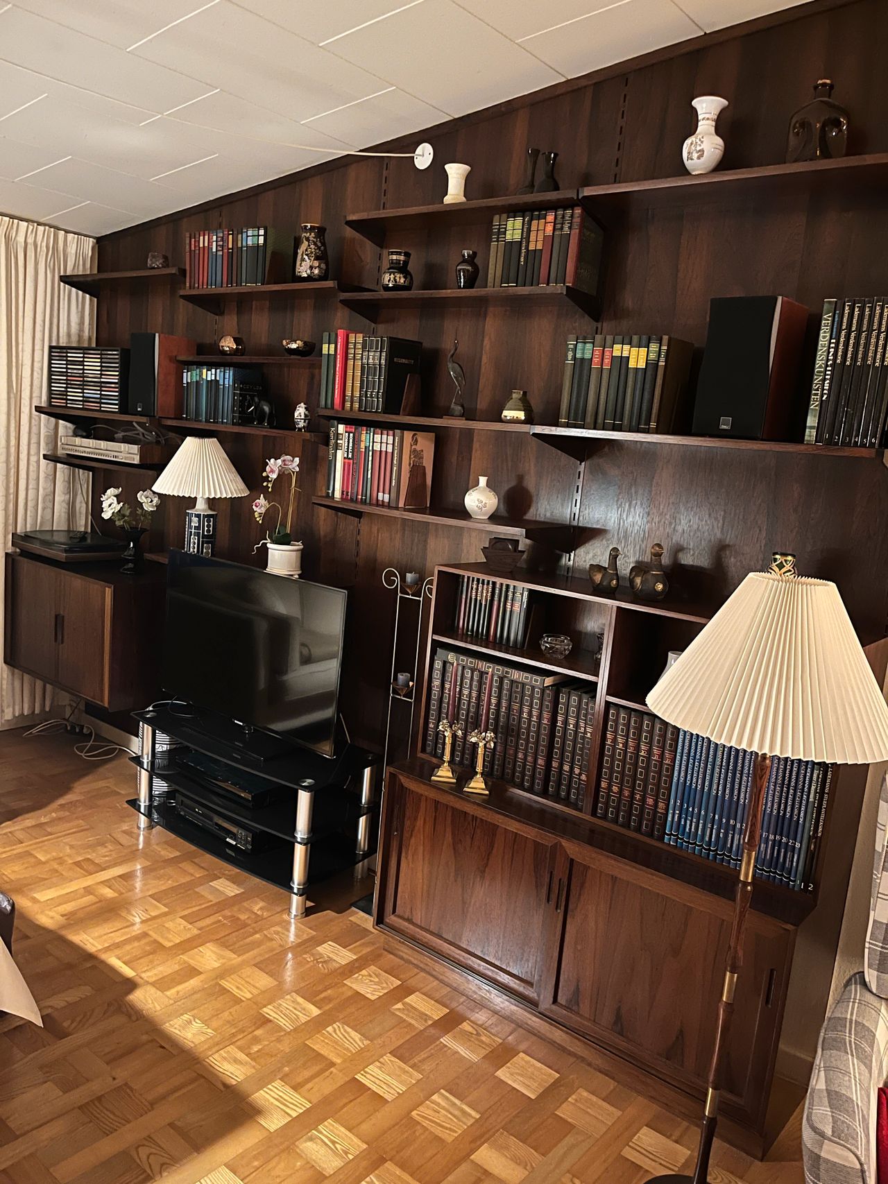 Reolvæg i palisander med bagpaneler, skinner, hylder, skab med jalousilåger.