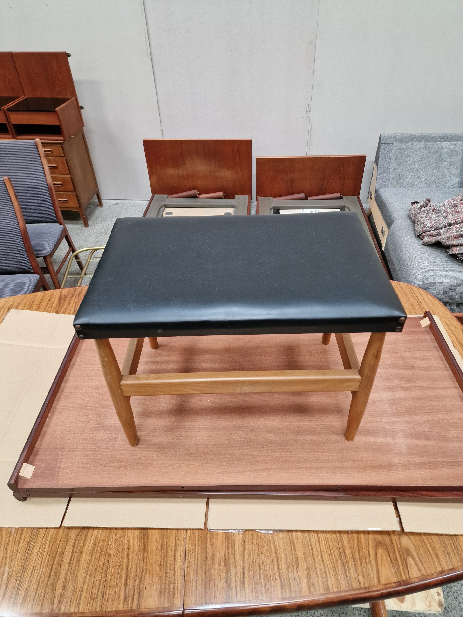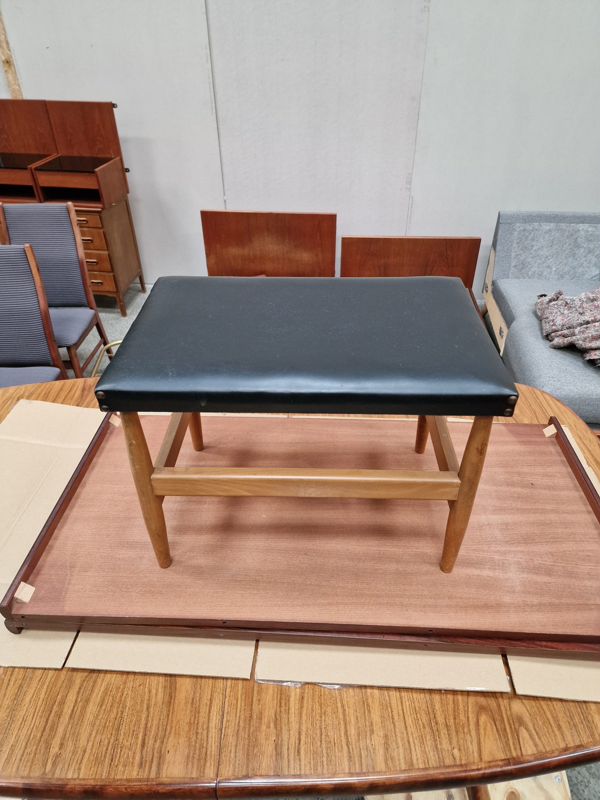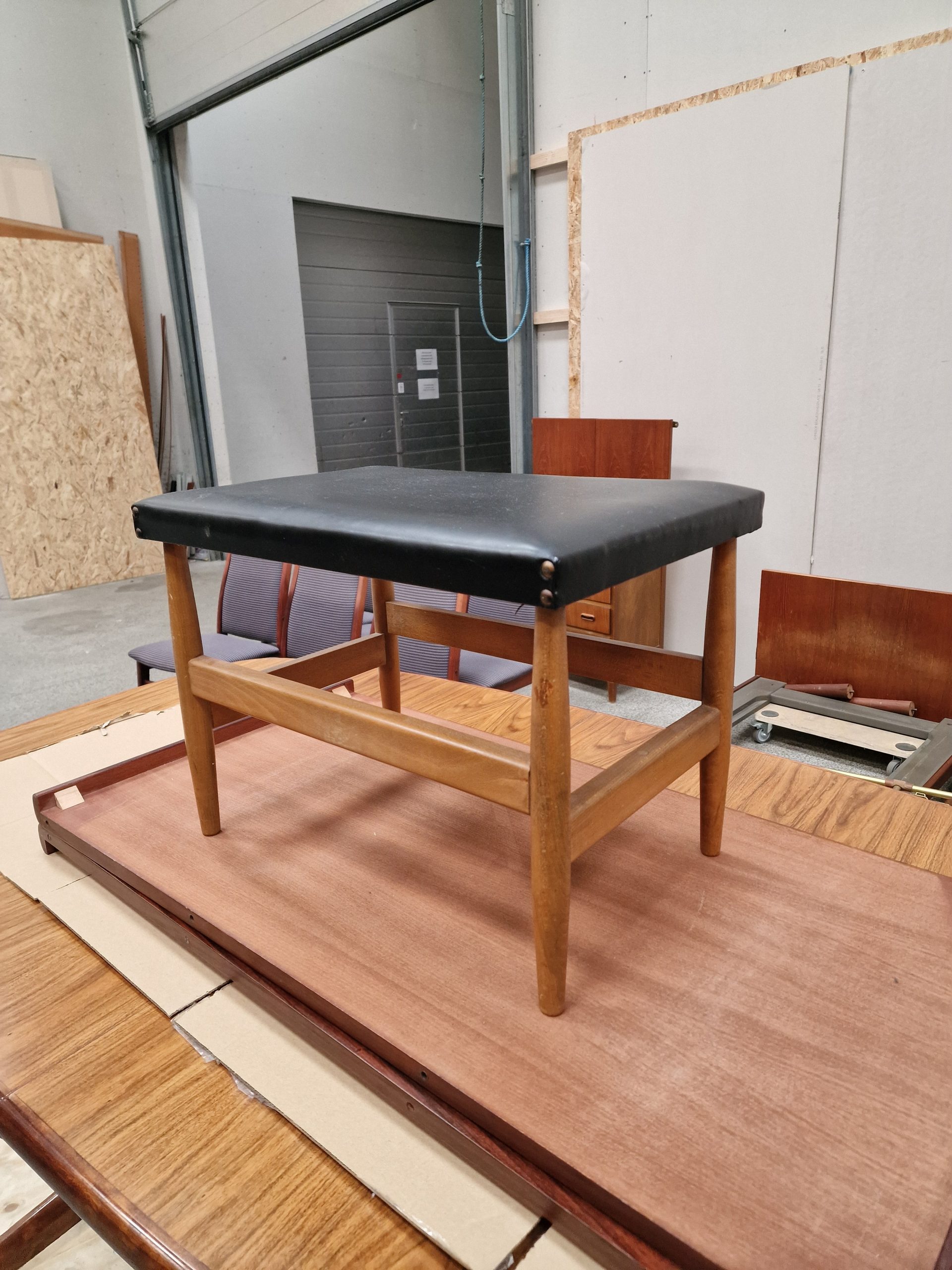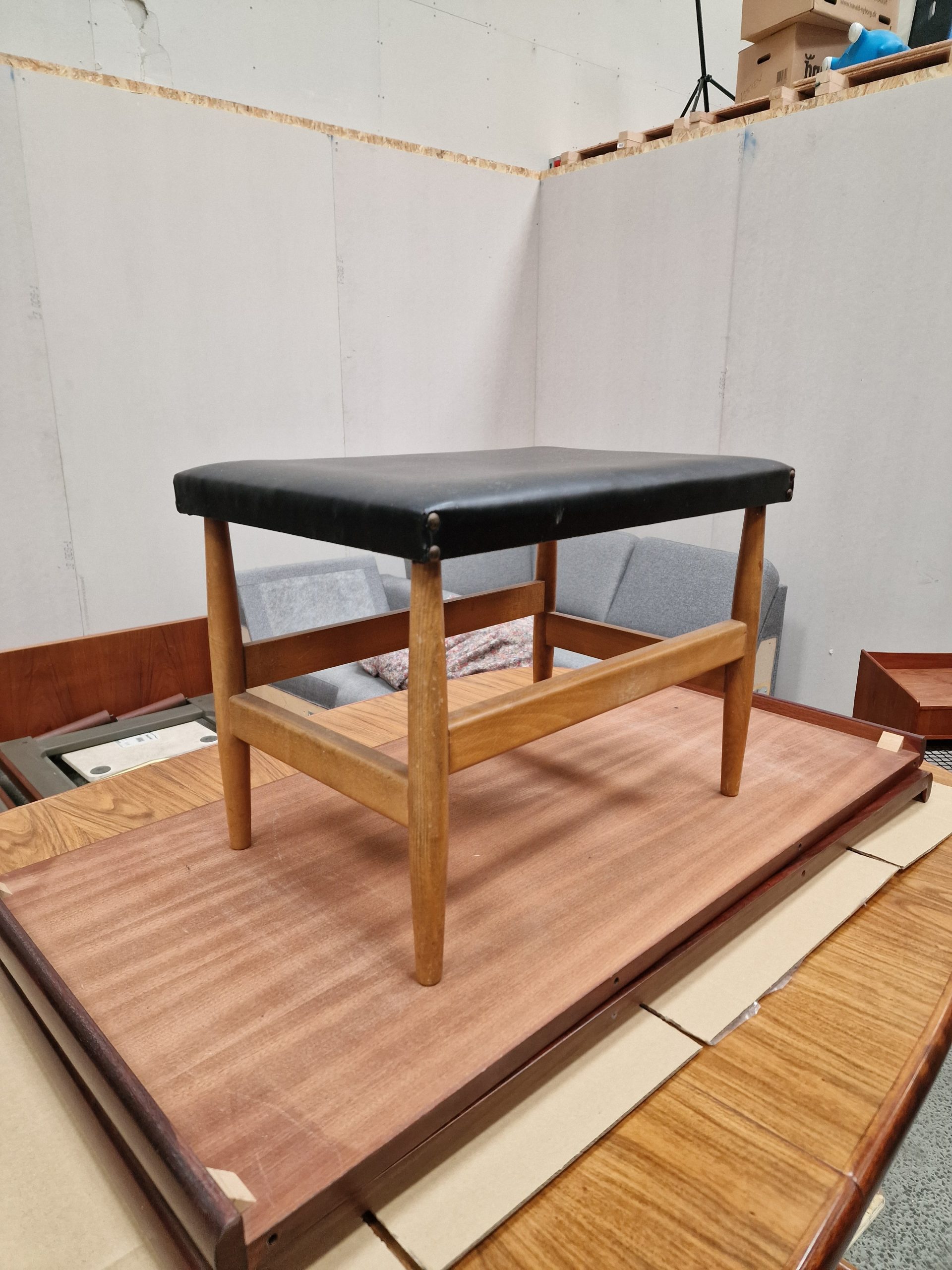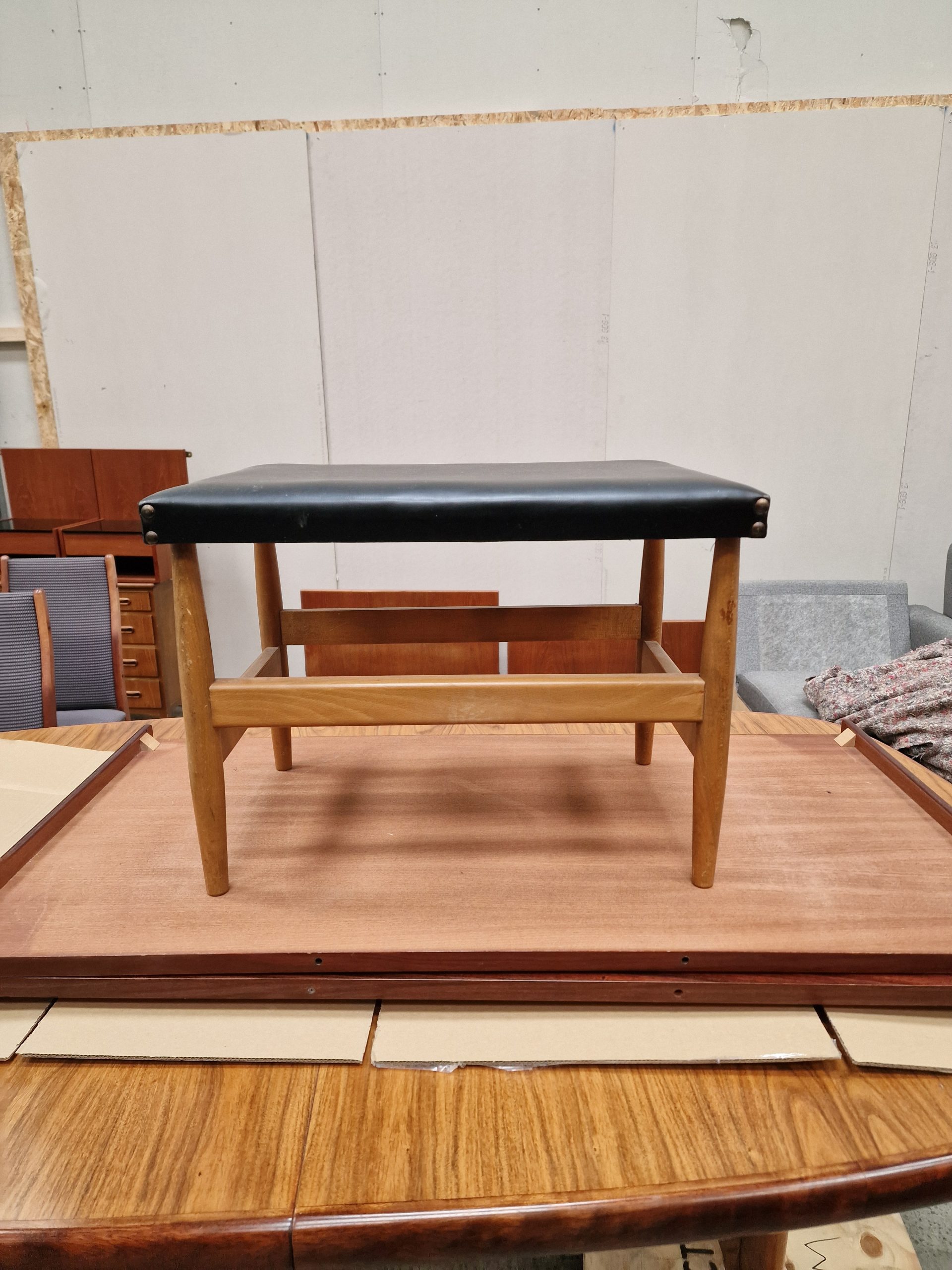 Skammel med flotte former i bøgetræ og skai
