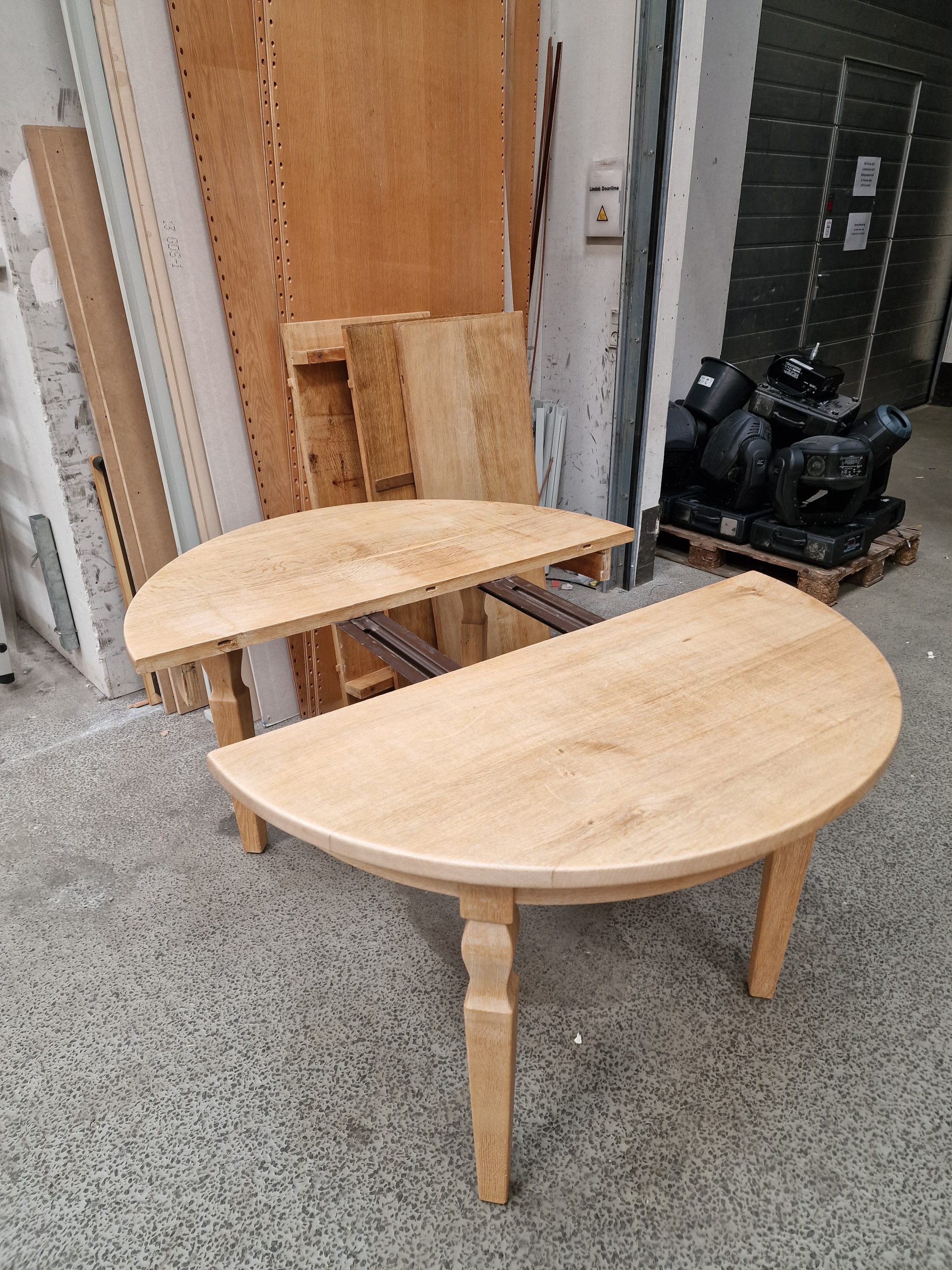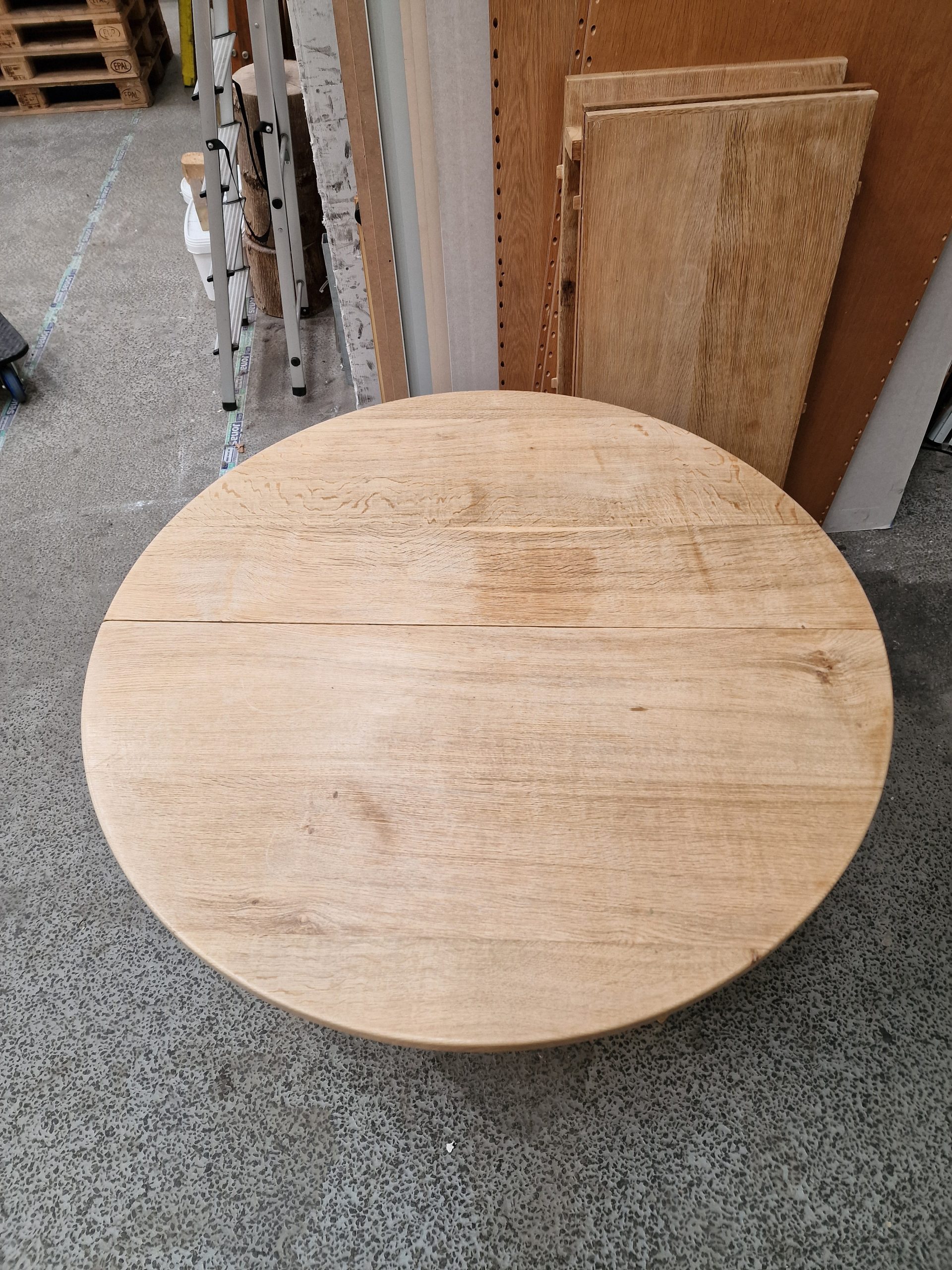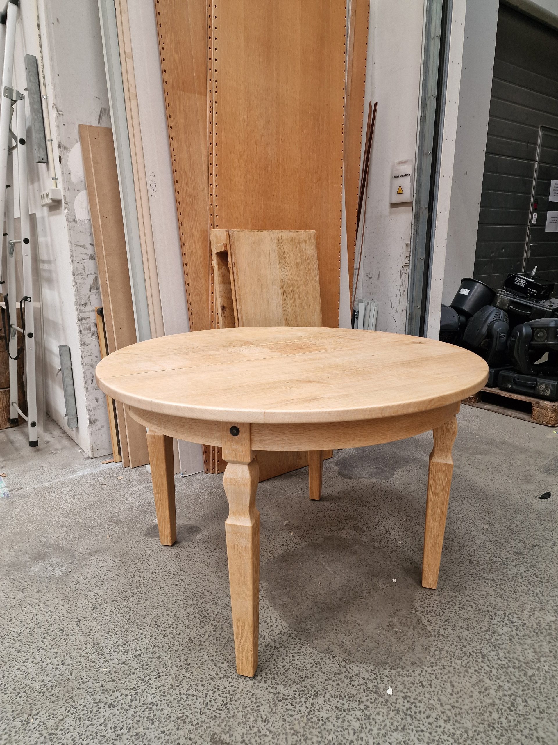 Tre tillægsplader på hver 48,5 cm, den ene er med sarg og er massiv, de to andre er finéret. Bordet er stabilt og pænt og føles som sæbebehandlet af tidligere ejer. Det har nogle brugsspor, se billederne for standen.